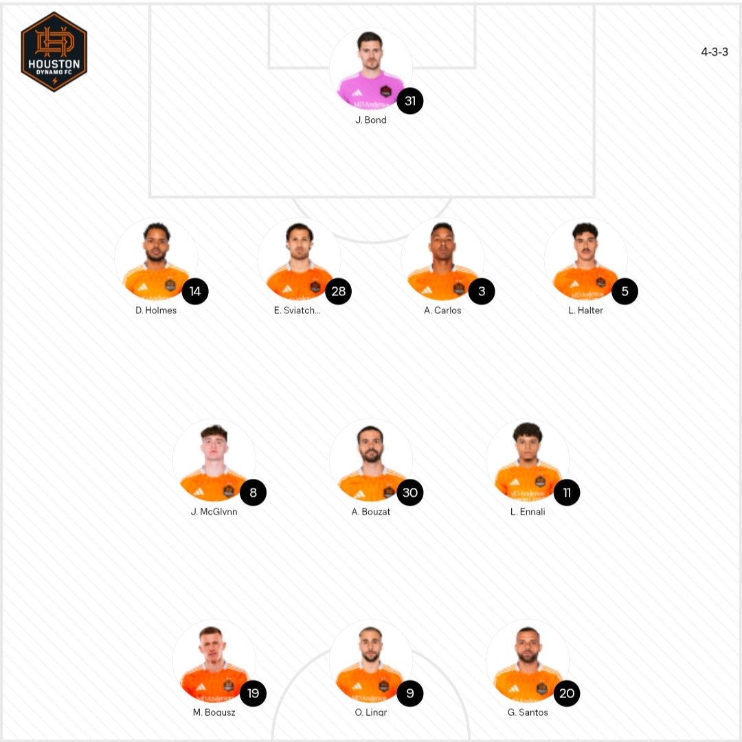 휴스턴은 조너선 본드, 루카스 할터, 안토니오 카를로스, 에릭 스비아첸코, 로렌스 에날리, 잭 맥글린, 어거스틴 부자트, 듀에인 홈즈, 길레르미, 마테우스 보거스, 온드레이 링그르가 선발 출격한다.