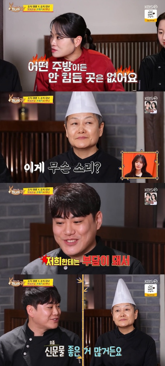 김숙은 "난 신계숙 셰프님 매장에서 일할래"라며 정지선처럼 혼내면 주눅이 들어서 못한다고 말했다.