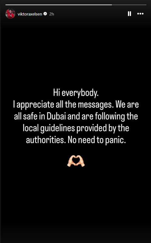 이에 악셀센은 1일(한국시간) 자신의 사회관계망서비스(SNS) 인스타그램 스토리를 통해 "걱정해주셔서 감사하다. 당국의 지시에 따라 두바이에서 안전하게 지내고 있다. 걱정하지 않아도 된다"는 글을 남기며 상황을 설명했다.