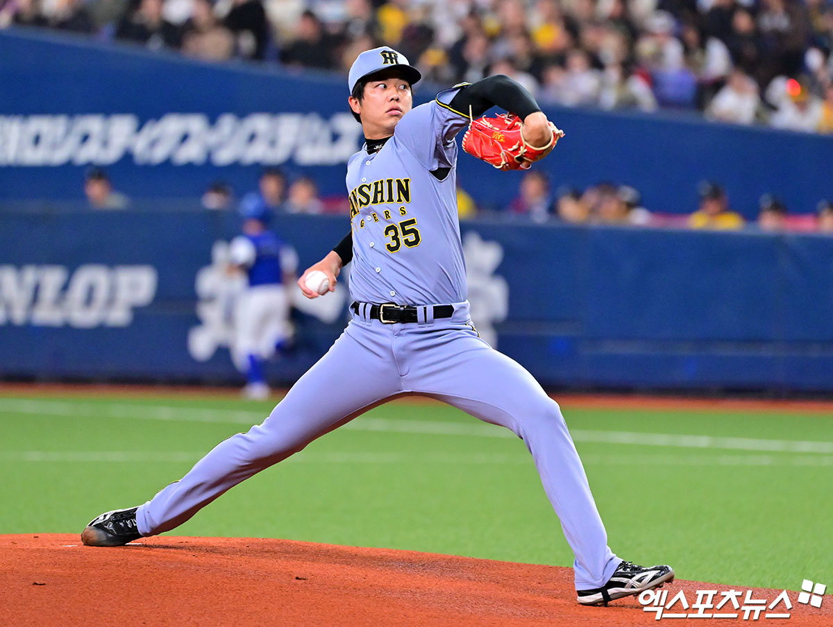 (엑스포츠뉴스 오사카(일본), 김한준 기자) 2일 오후 일본 오사카 교세라돔에서 열린 대한민국과 한신 타이거즈의 평가전 경기, 1회초 한신 선발투수 사이키가 공을 힘차게 던지고 있다.