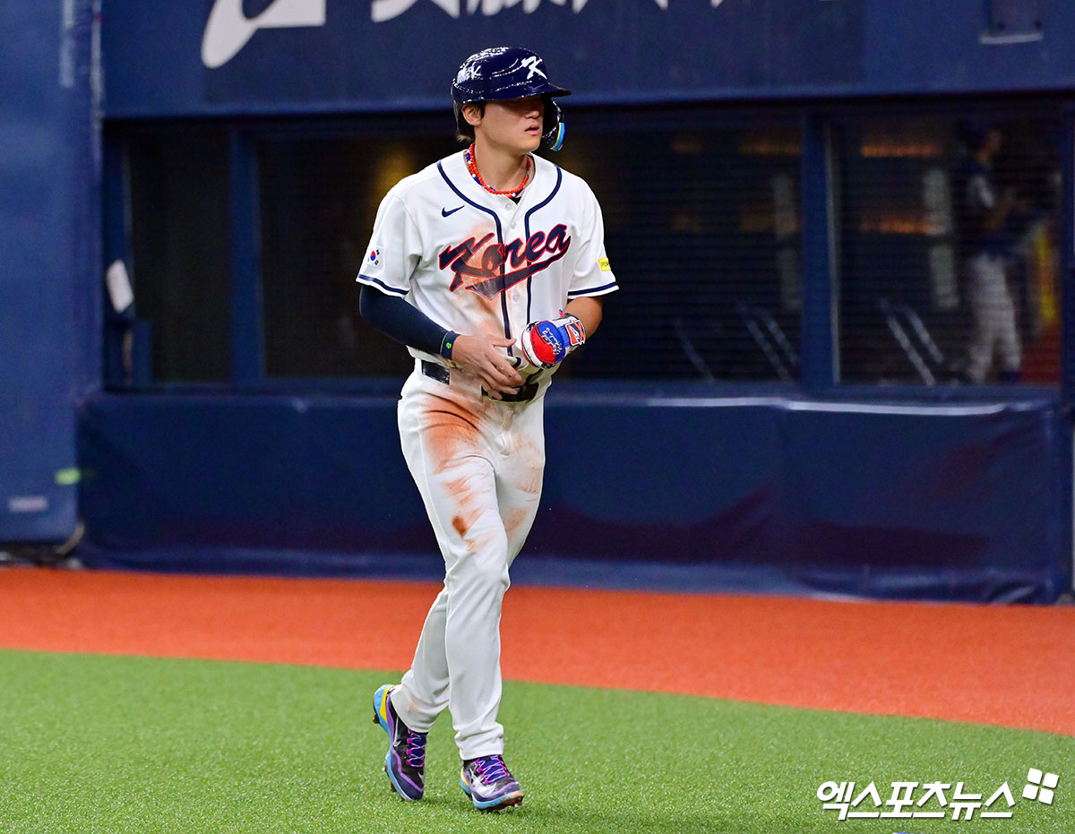 (엑스포츠뉴스 오사카(일본), 김한준 기자) 2일 오후 일본 오사카 교세라돔에서 열린 대한민국과 한신 타이거즈의 평가전 경기, 1회초 2사 1,2루 대한민국 김도영이 문보경의 1타점 적시타때 득점에 성공하고 있다.