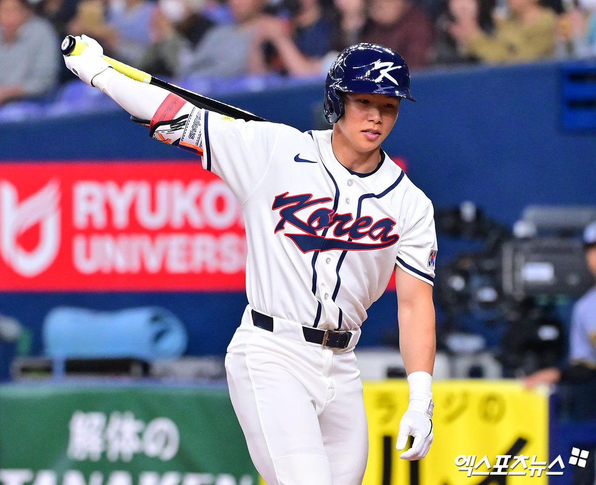 (엑스포츠뉴스 오사카(일본), 김한준 기자) 2일 오후 일본 오사카 교세라돔에서 열린 대한민국과 한신 타이거즈의 평가전 경기, 1회초 2사 2,3루 대한민국 김혜성이 헛스윙 삼진을 당하고 있다.