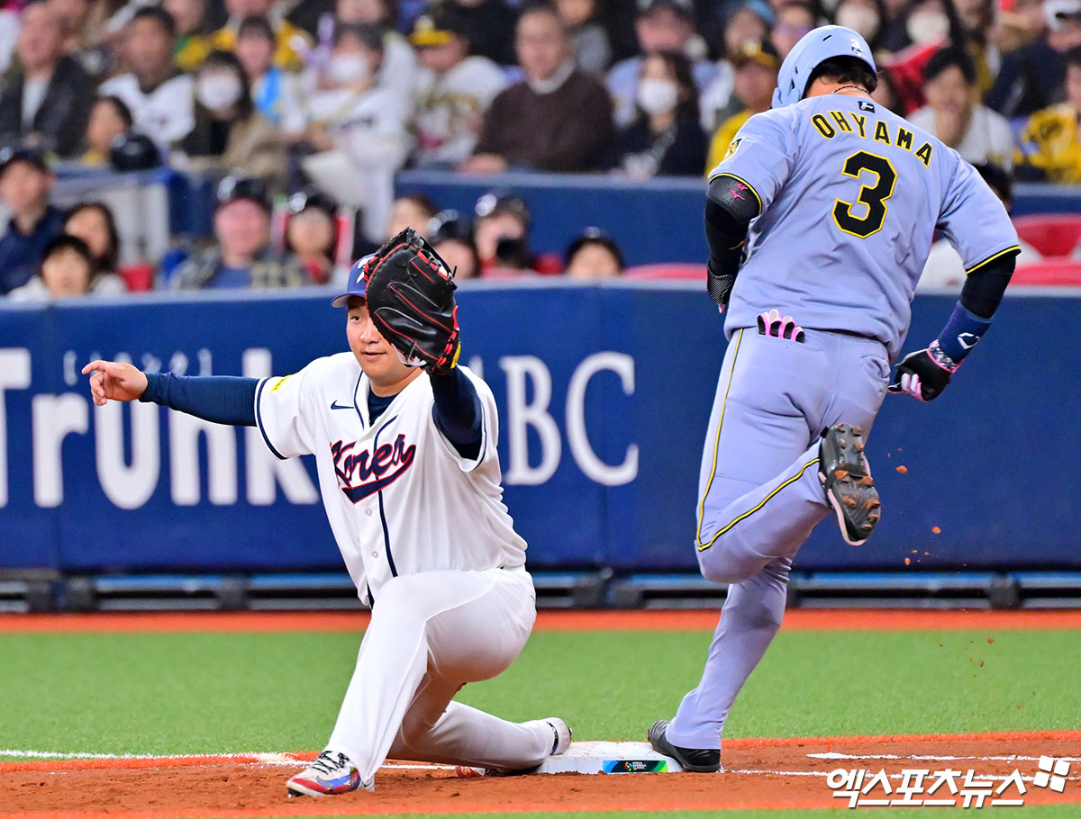 (엑스포츠뉴스 오사카(일본), 김한준 기자) 2일 오후 일본 오사카 교세라돔에서 열린 대한민국과 한신 타이거즈의 평가전 경기, 2회말 대한민국 문보경이 김도영의 송구를 잡고 있다.