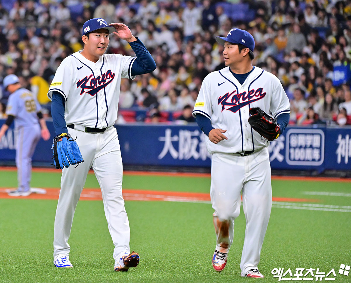 (엑스포츠뉴스 오사카(일본), 김한준 기자) 2일 오후 일본 오사카 교세라돔에서 열린 대한민국과 한신 타이거즈의 평가전 경기, 4회말 수비를 마친 대한민국 손주영이 더그아웃으로 향하고 있다.