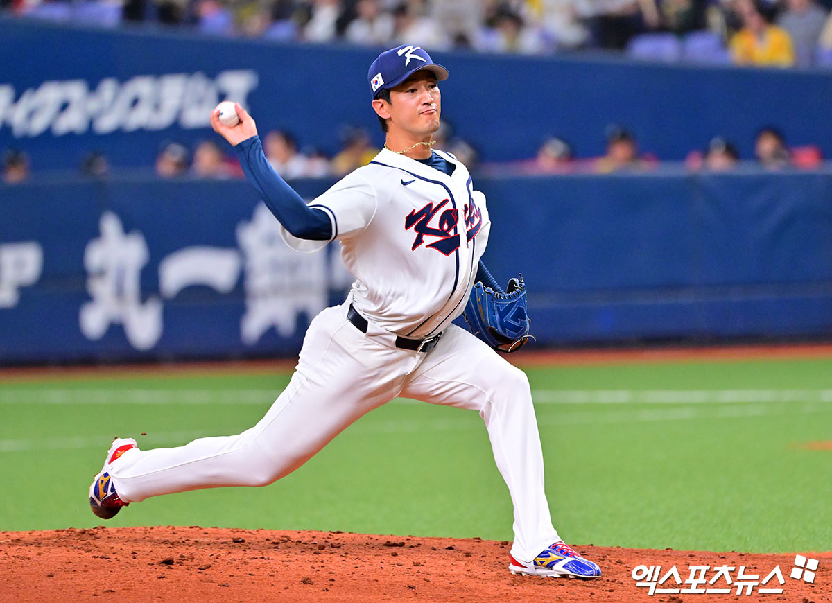 (엑스포츠뉴스 오사카(일본), 김한준 기자) 2일 오후 일본 오사카 교세라돔에서 열린 대한민국과 한신 타이거즈의 평가전 경기, 5회말 대한민국 고영표가 공을 힘차게 던지고 있다.