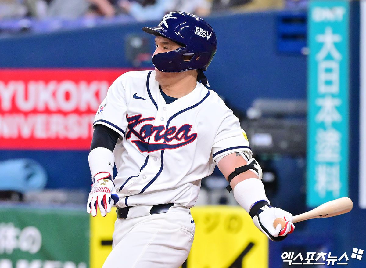 (엑스포츠뉴스 오사카(일본), 김한준 기자) 2일 오후 일본 오사카 교세라돔에서 열린 대한민국과 한신 타이거즈의 평가전 경기, 6회초 2사 1루 대한민국 박동원이 좌전안타를 날리고 있다.