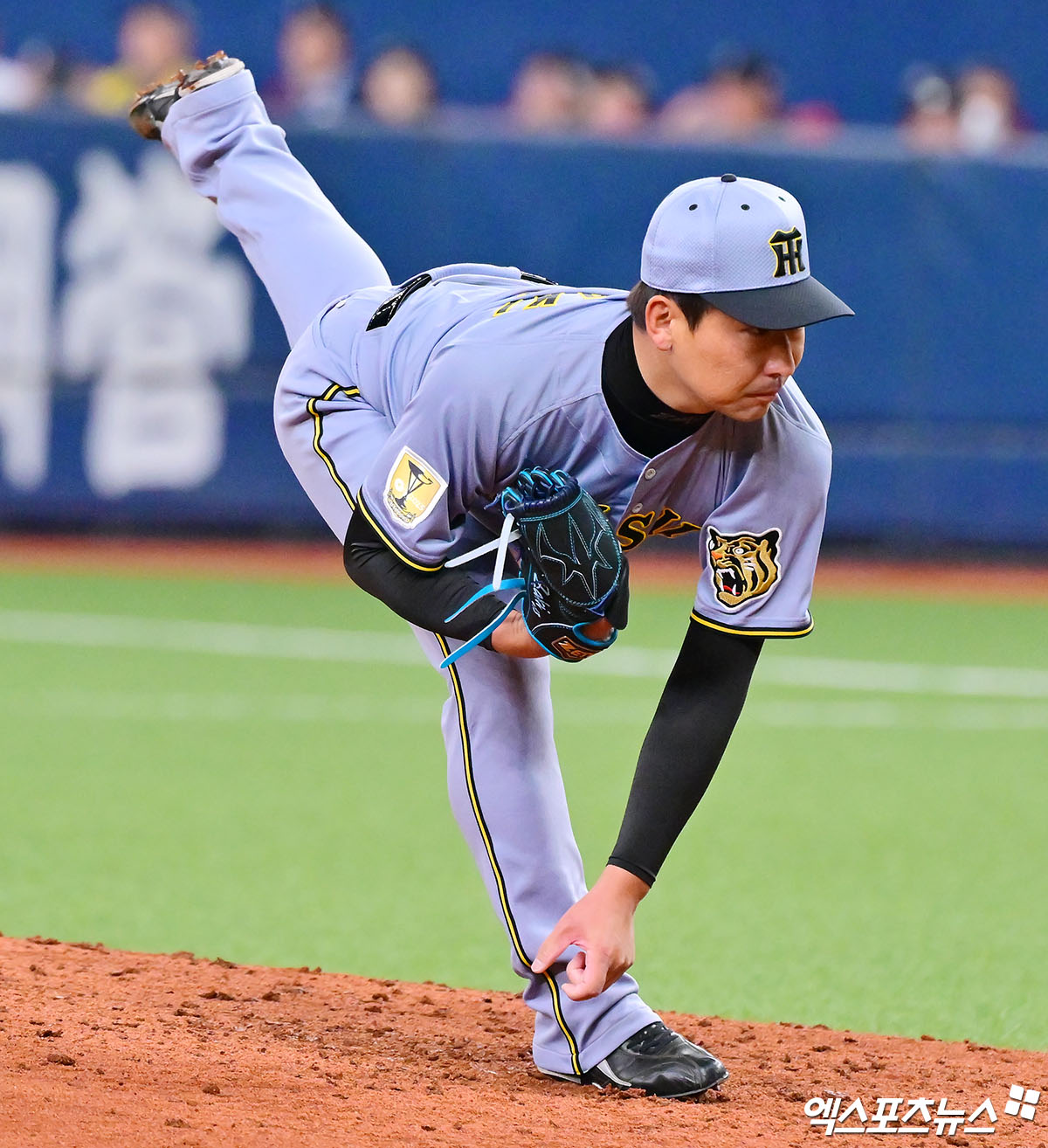 (엑스포츠뉴스 오사카(일본), 김한준 기자) 2일 오후 일본 오사카 교세라돔에서 열린 대한민국과 한신 타이거즈의 평가전 경기, 9회초 한신 이와자키가 공을 힘차게 던지고 있다.