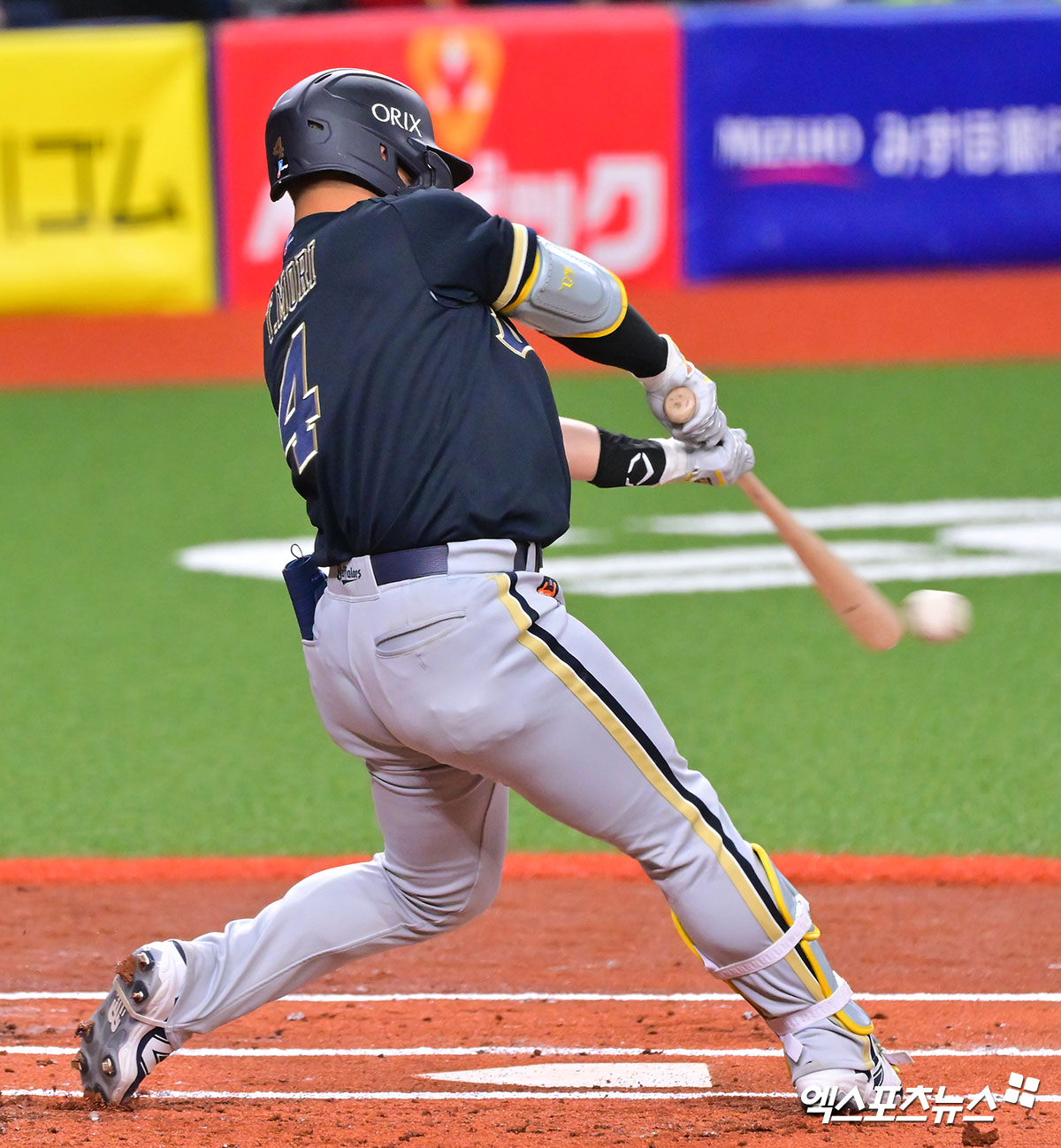 (엑스포츠뉴스 오사카(일본), 김한준 기자) 2일 오후 일본 오사카 교세라돔에서 열린 일본과 오릭스 버팔로스의 평가전 경기, 1회말 1사 1,2루 오릭스 모리가 1타점 적시타를 날리공 ㅣㅆ다.