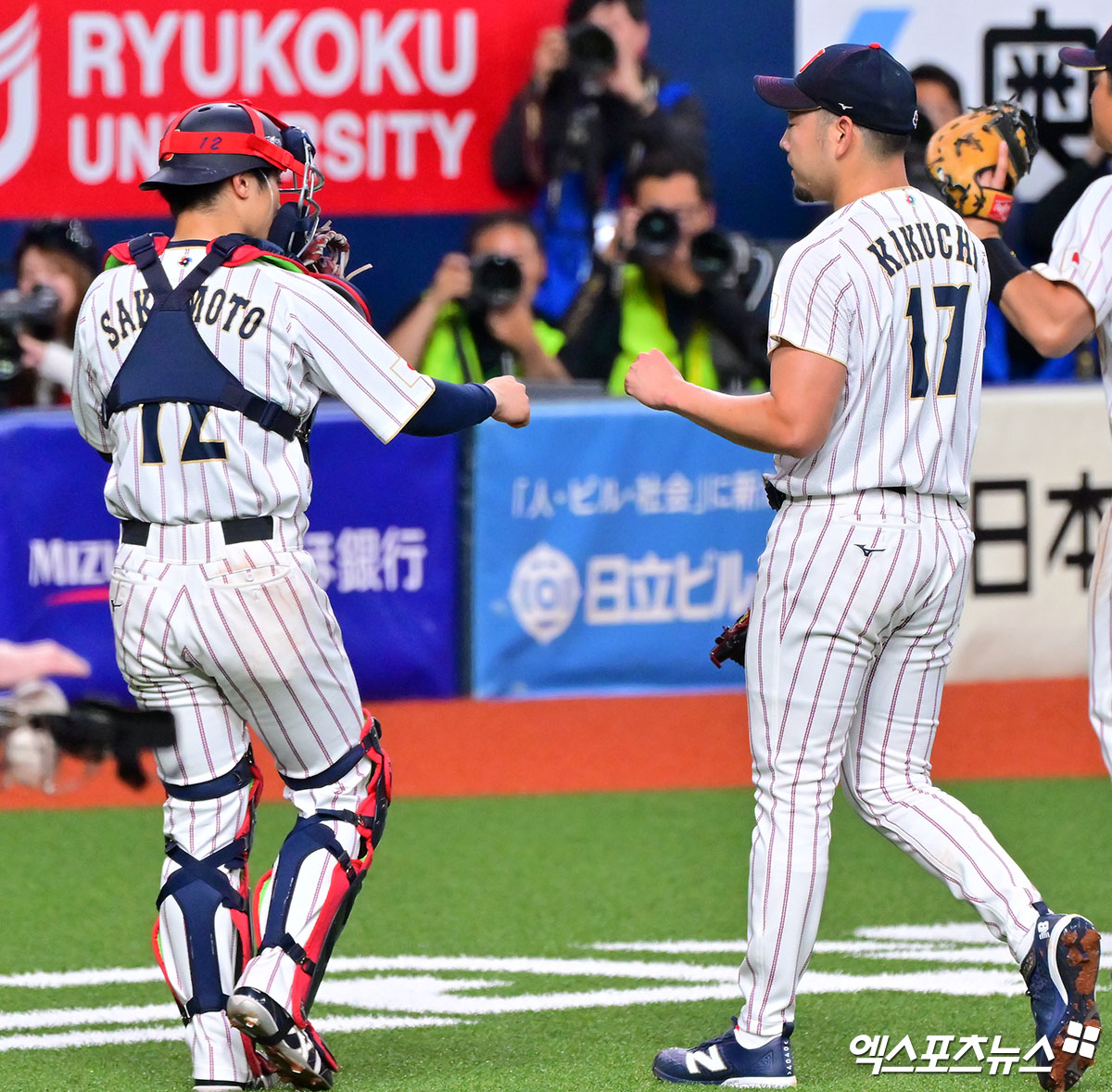 (엑스포츠뉴스 오사카(일본), 김한준 기자) 2일 오후 일본 오사카 교세라돔에서 열린 일본과 오릭스 버팔로스의 평가전 경기, 1회말 수비를 마친 일본 기쿠치가 사카모토와 대화를 나누고 있다.