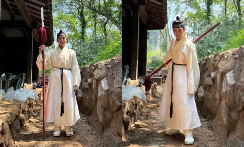 공개된 사진에서 박지훈은 유배지에서 창을 든 채 진지한 표정을 짓고 있다.