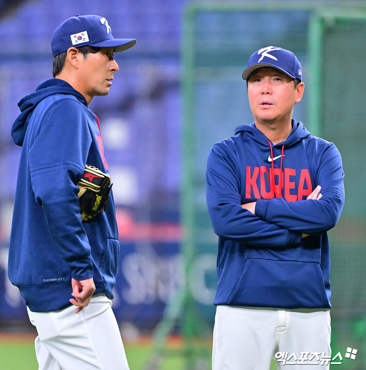 (엑스포츠뉴스 오사카(일본), 김한준 기자) 3일 오후 일본 오사카 교세라돔에서 열리는 한국과 오릭스 버팔로스의 평가전 경기, 한국 류지현 감독이 강인권 코치와 대화를 나누고 있다.