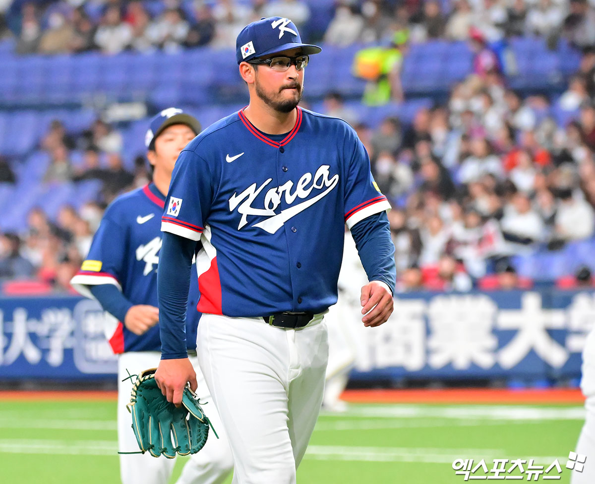 (엑스포츠뉴스 오사카(일본), 김한준 기자) 3일 오후 일본 오사카 교세라돔에서 열린 한국과 오릭스 버팔로스의 평가전 경기, 1회말 수비를 마친 한국 선발투수 데인 더닝이 더그아웃으로 향하고 있다.