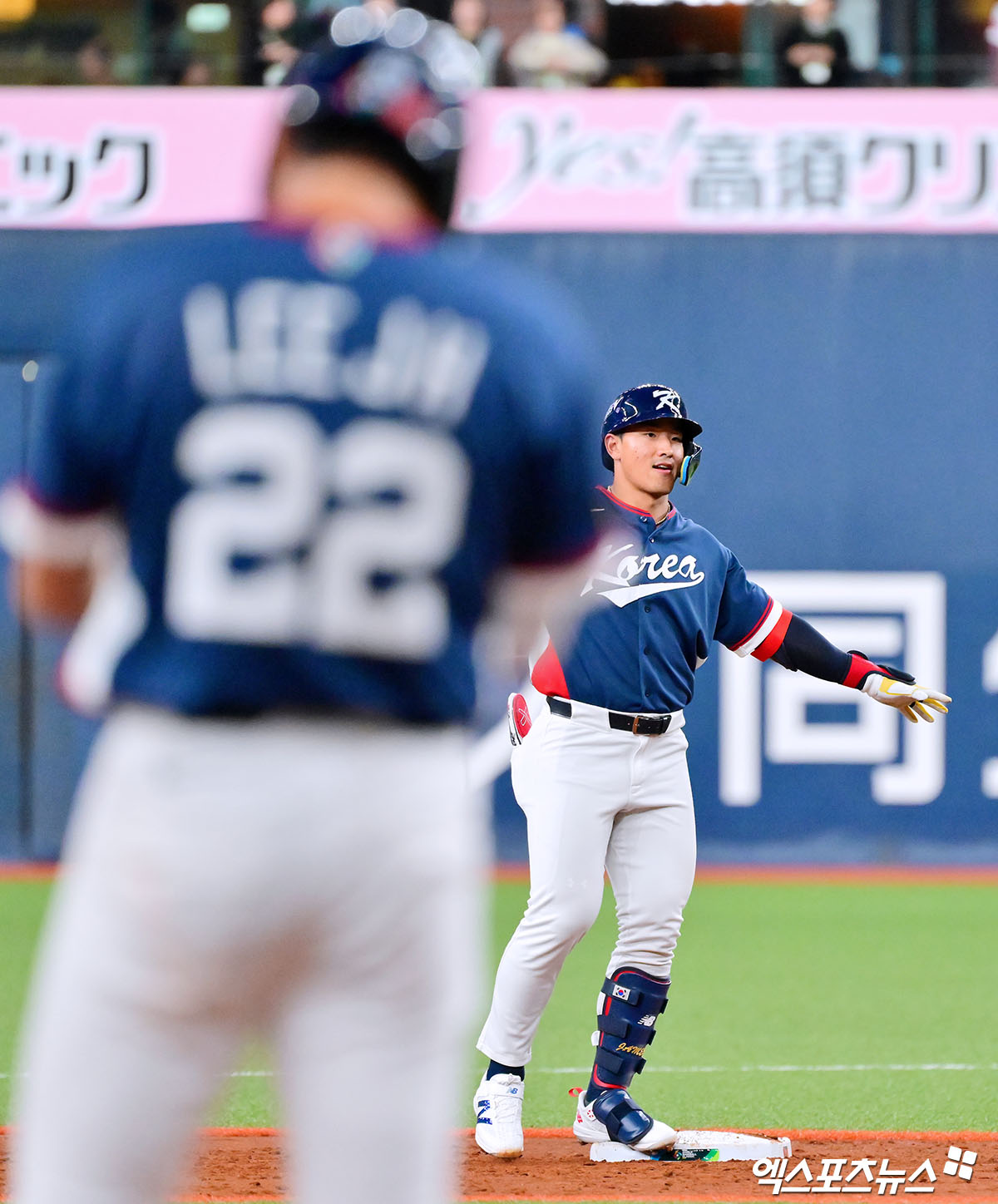 (엑스포츠뉴스 오사카(일본), 김한준 기자) 3일 오후 일본 오사카 교세라돔에서 열린 한국과 오릭스 버팔로스의 평가전 경기, 2회초 2사 1,2루 한국 안현민이 1타점 2루타를 날리고 있다.
