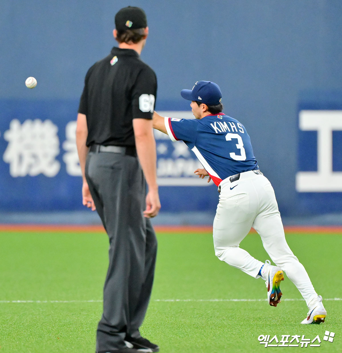 (엑스포츠뉴스 오사카(일본), 김한준 기자) 3일 오후 일본 오사카 교세라돔에서 열린 한국과 오릭스 버팔로스의 평가전 경기, 3회말 무사 2루 한국 김혜성이 포구 실책을 하고 있다.