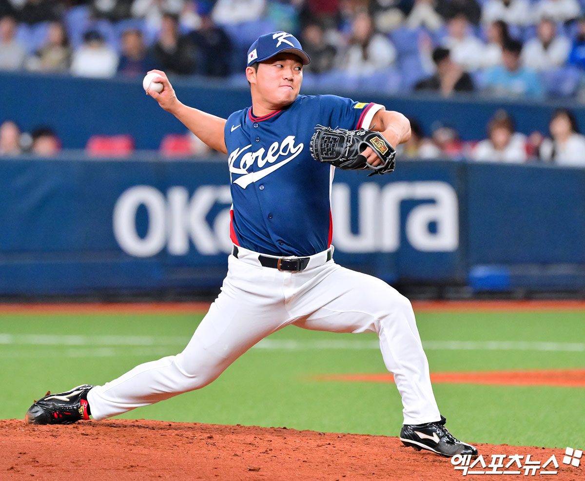 (엑스포츠뉴스 오사카(일본), 김한준 기자) 3일 오후 일본 오사카 교세라돔에서 열린 한국과 오릭스 버팔로스의 평가전 경기, 4회말 2사 만루 한국 고우석이 공을 힘차게 던지고 있다.