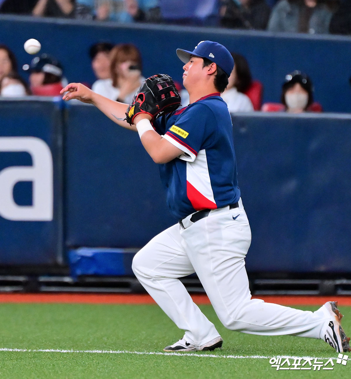 (엑스포츠뉴스 오사카(일본), 김한준 기자) 3일 오후 일본 오사카 교세라돔에서 열린 한국과 오릭스 버팔로스의 평가전 경기, 7회말 한국 노시환이 오릭스 키타의 타구를 직선타로 처리하고 있다.