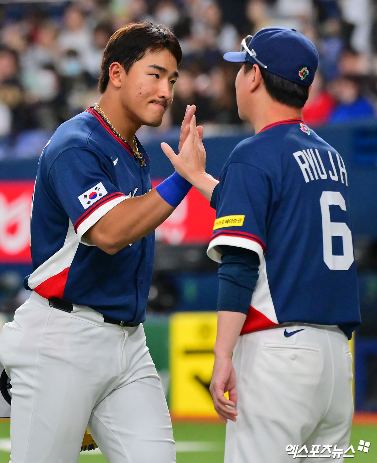 이날 경기에서 승리한 한국 김도영이 류지현 감독과 하이파이브를 하고 있다.