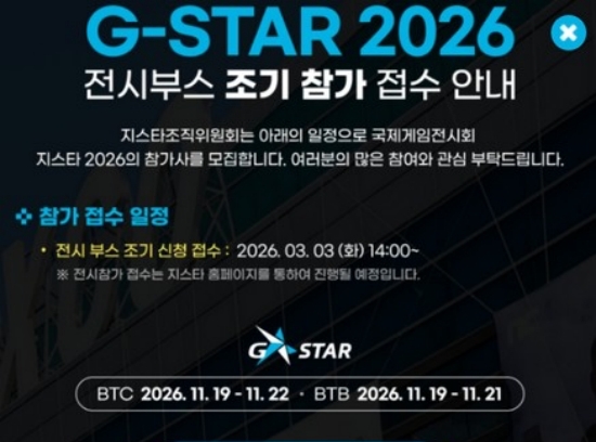 한편, 한국게임산업협회(K-GAMES)가 주최하고 조직위·부산정보산업진흥원이 공동 주관하는 '지스타 2026'은 11월 19일부터 22일까지 4일간 부산 벡스코에서 개최된다.
