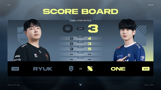 난타전 가운데 점수 리드를 지속해서 유지한 ONE. 그는 상대에게 동점 상황을 허용하지 않으며 전후반 5대3으로 경기를 가져갔다. 그리고 이 경기를 통해 세트스코어 3대0 승리와 'FSL' 생존을 확정했다. 반면, RYUK은 아쉽게 이번 대회에서의 여정을 마무리했다.