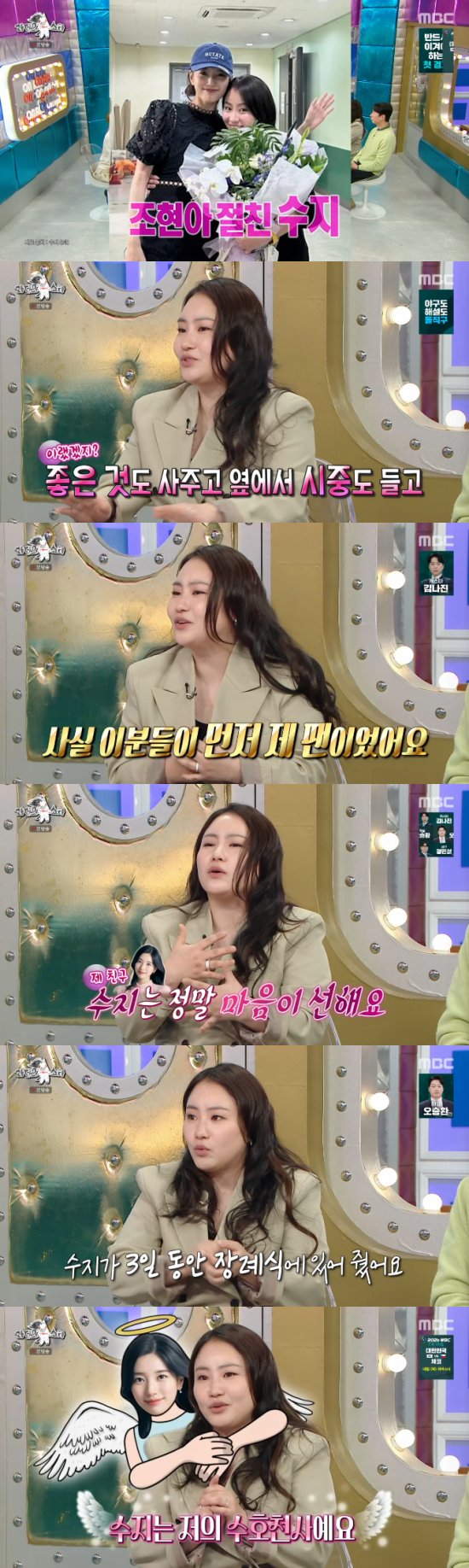 조현아는 "그리고 장지까지 가서 어머니를 위해 기도를 해줬다. 어머니를 잃은 아픔을 그 친구에게서 치유를 받았다. 방송에서 수지랑 친하다는 얘기 말고, 수지는 저의 수호천사라는 말을 꼭 하고 싶었다"고 애정을 보였다.