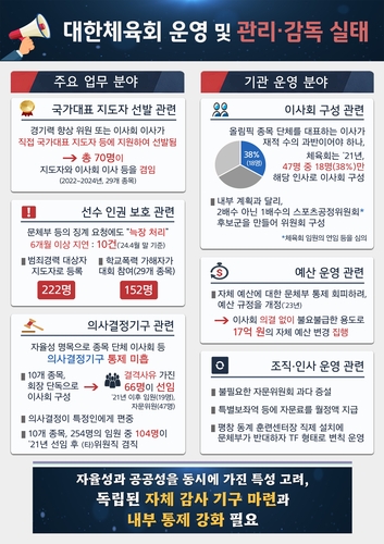 감사 결과 지난 2022∼2024년 29개 종목 단체에서 국가대표 지도자 선발 방식 결정과 후보자 평가를 담당하는 이사 및 경기력향상위원회 위원 70명이 해당 직을 유지한 채 국가대표 지도자에 지원해 선발됐다.
