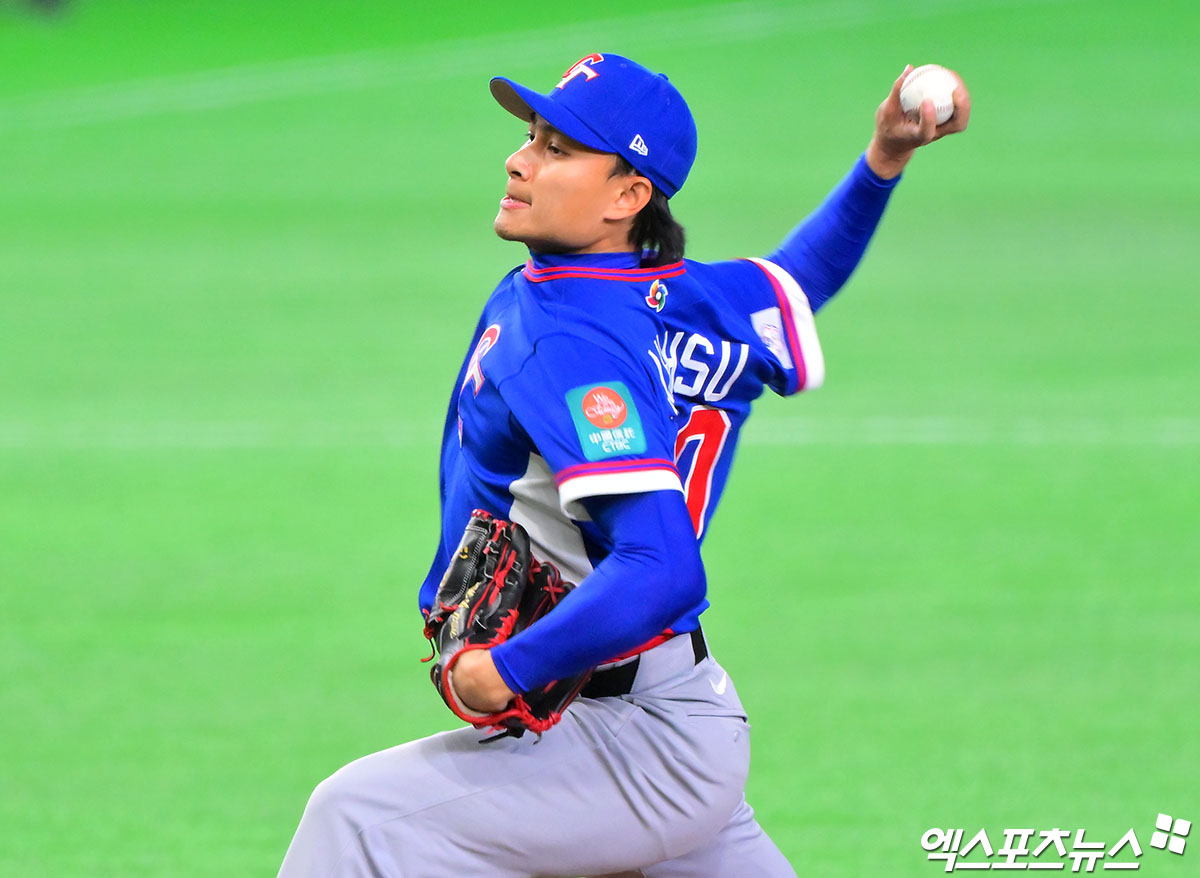 (엑스포츠뉴스 도쿄(일본), 김한준 기자) 5일 오후 일본 도쿄돔에서 열린 2026 월드베이스볼클래식(WBC) C조 대만과 호주의 경기, 1회말 대만 선발투수 쉬러시가 공을 힘차게 던지고 있다.