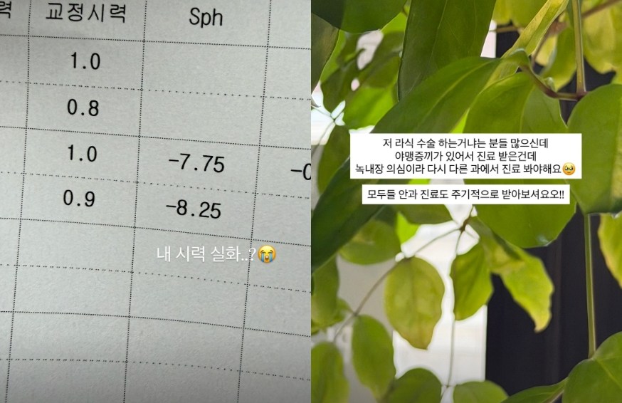 이다은은 "저 라식 수술 하는 거냐는 분들 많으신데, 야맹증끼가 있어서 진료 받은 것"이라며 "녹내장 의심이라 다시 다른 과에서 진료를 봐야 한다"고 전해 우려를 자아냈다.