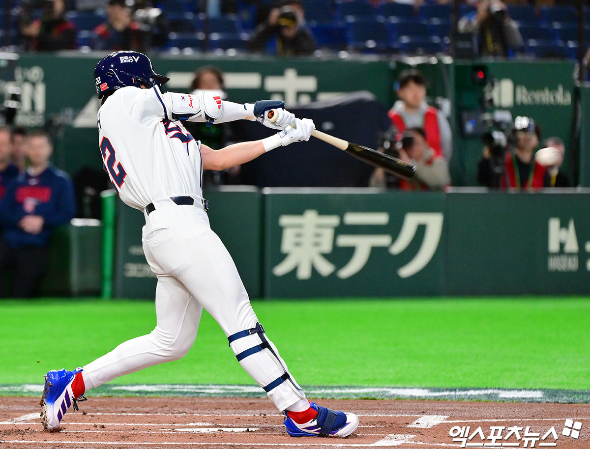 (엑스포츠뉴스 도쿄(일본), 김한준 기자) 5일 오후 일본 도쿄돔에서 열린 2026 월드베이스볼클래식(WBC) C조 체코와 대한민국의 경기, 1회말 1사 1루 한국 이정후가 우전안타를 날리고 있다.