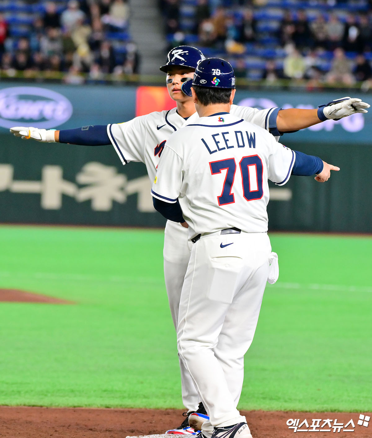 (엑스포츠뉴스 도쿄(일본), 김한준 기자) 5일 오후 일본 도쿄돔에서 열린 2026 월드베이스볼클래식(WBC) C조 체코와 대한민국의 경기, 2회말 무사 2루 한국 김주원이 안타를 날린 후 세리머니를 하고 있다.