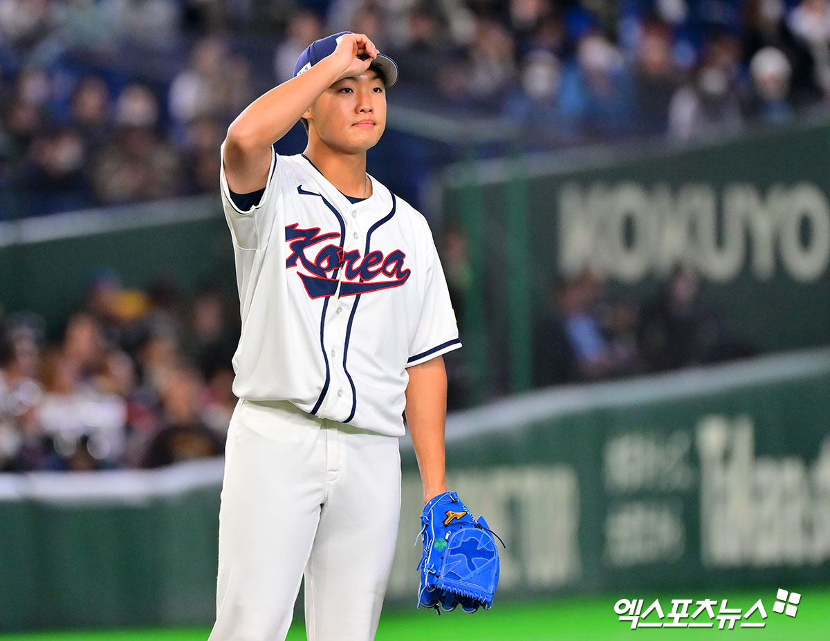 (엑스포츠뉴스 도쿄(일본), 김한준 기자) 5일 오후 일본 도쿄돔에서 열린 2026 월드베이스볼클래식(WBC) C조 체코와 대한민국의 경기, 5회초 한국 정우주가 체코 프레아다에게 사구를 허용한 후 사과 인사를 하고 있다.