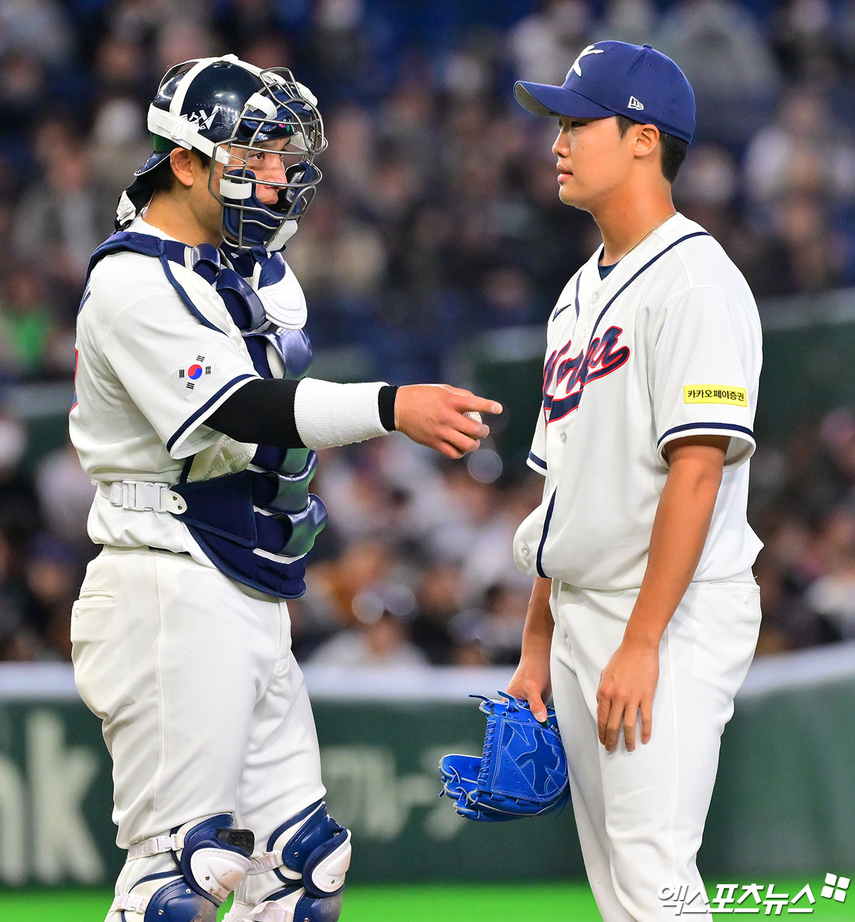 (엑스포츠뉴스 도쿄(일본), 김한준 기자) 5일 오후 일본 도쿄돔에서 열린 2026 월드베이스볼클래식(WBC) C조 체코와 대한민국의 경기, 5회초 1사 1,2루 한국 박동원이 마운드를 방문해 정우주와 대화를 하고 있다.