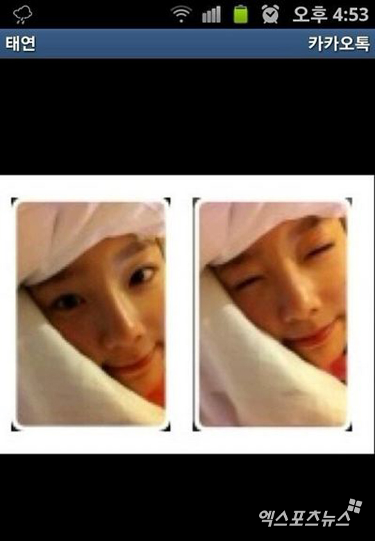 공개된 사진은 태연의 카카오톡 프로필 사진을 캡처한 화면인 것으로 알려졌다. 특히, 태연은 민낯 상태로 이불속에 폭 파묻혀 아기 같은 모습을 뽐내 눈길을 끌고 있다.