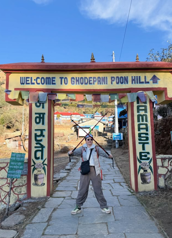 또 다른 사진에서는 ‘WELCOME TO GHODEPANI POON HILL’이라고 적힌 입구 앞에서 트레킹 스틱을 들고 포즈를 취하며 유쾌한 매력을 드러냈다.