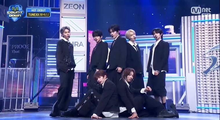 튜넥스(동규, 인후, 타이라, 성준, 제온, 시환, 아틱)는 지난 5일 생방송으로 진행된 Mnet '엠카운트다운'에서 첫 번째 미니앨범 'SET BY US ONLY(셋 바이 어스 온리)'의 타이틀곡 '내가 살아있다는 증거'와 수록곡 '100%' 무대를 음악 방송 최초로 공개했다.