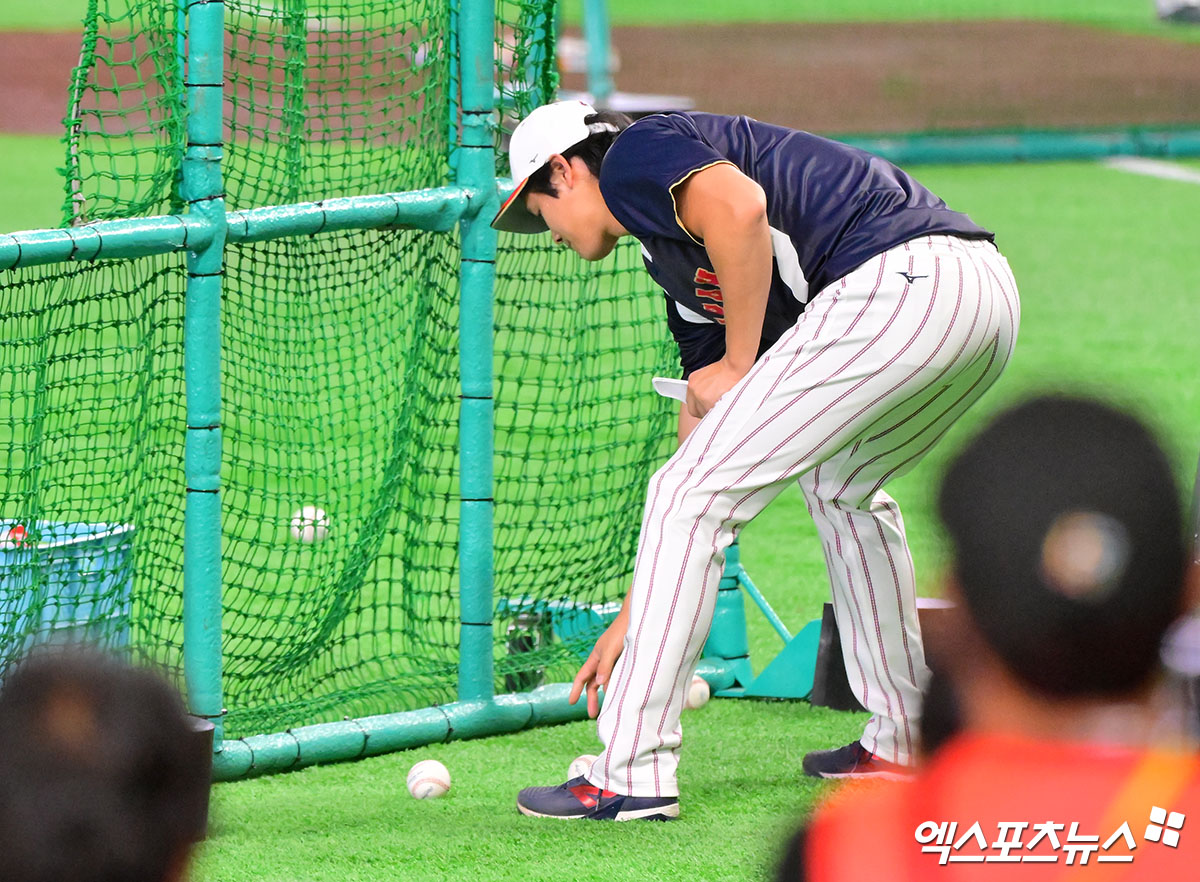 (엑스포츠뉴스 도쿄(일본), 김한준 기자) 7일 오후 일본 도쿄돔에서 열린 2026 월드베이스볼클래식(WBC) C조 한국과 일본의 경기, 훈련을 마친 일본 오타니가 공을 정리하고 있다.