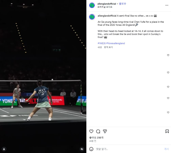 대회 공식 인스타그램 채널이 안세영과 그의 라이벌 천위페이 간 맞대결을 집중 조명하면서 라이벌전의 긴장감이 한층 고조되는 분위기다.