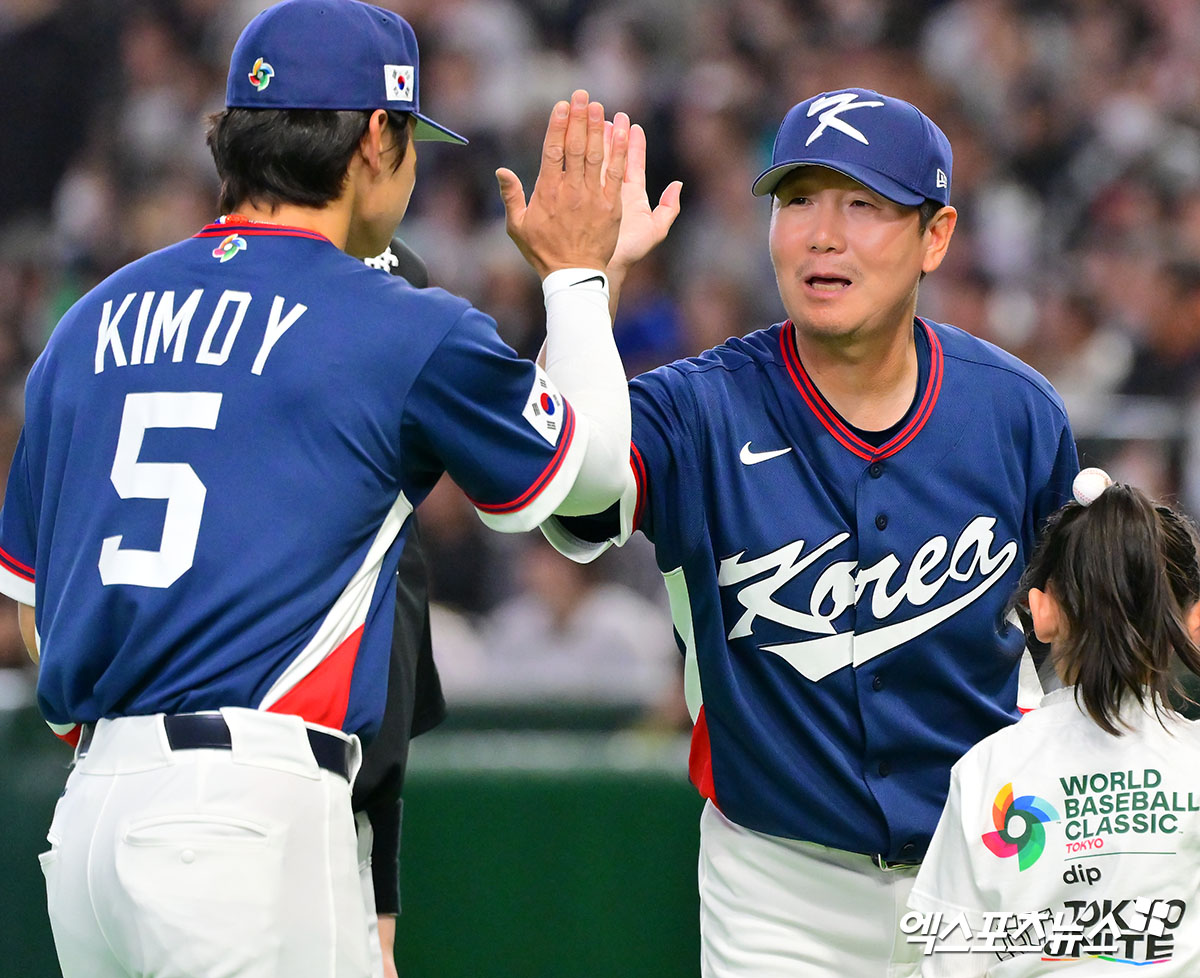 (엑스포츠뉴스 도쿄(일본), 김한준 기자) 7일 오후 일본 도쿄돔에서 열린 2026 월드베이스볼클래식(WBC) C조 한국과 일본의 경기, 한국 류지현 감독이 김도영과 하이파이브를 하고 있다.