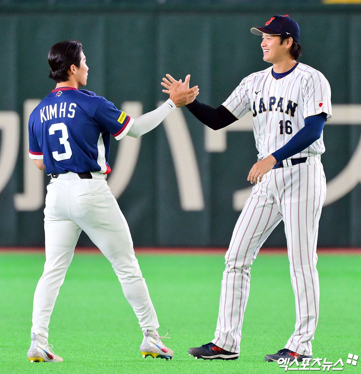 (엑스포츠뉴스 도쿄(일본), 김한준 기자) 7일 오후 일본 도쿄돔에서 열린 2026 월드베이스볼클래식(WBC) C조 한국과 일본의 경기, 경기 전 한국 김혜성과 일본 오타니가 인사를 나누고 있다.