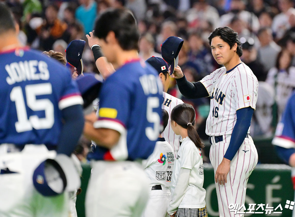 (엑스포츠뉴스 도쿄(일본), 김한준 기자) 7일 오후 일본 도쿄돔에서 열린 2026 월드베이스볼클래식(WBC) C조 한국과 일본의 경기, 경기 전 일본 오타니가 한국 대표팀을 향해 인사를 하고 있다.
