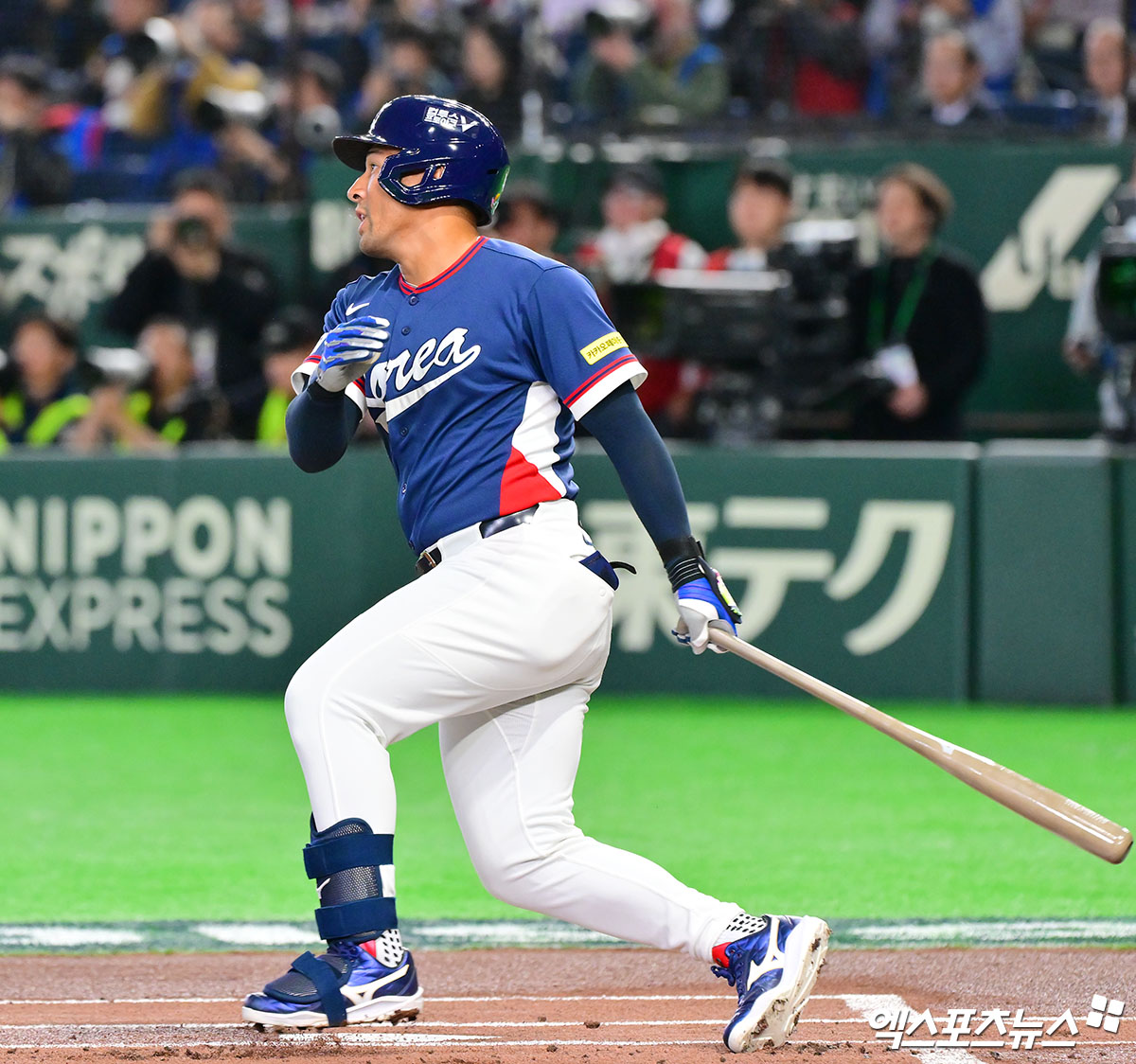 (엑스포츠뉴스 도쿄(일본), 김한준 기자) 7일 오후 일본 도쿄돔에서 열린 2026 월드베이스볼클래식(WBC) C조 한국과 일본의 경기, 1회초 무사 1루 한국 저마이 존스가 중전안타를 날리고 있다.