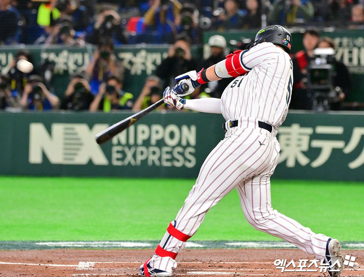(엑스포츠뉴스 도쿄(일본), 김한준 기자) 7일 오후 일본 도쿄돔에서 열린 2026 월드베이스볼클래식(WBC) C조 한국과 일본의 경기, 1회말 1사 2루 일본 스즈키가 투런 홈런을 날리고 있다.