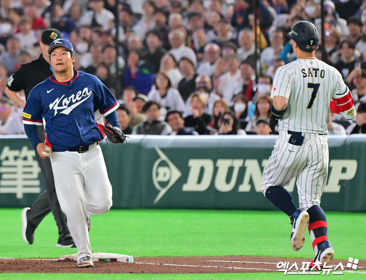 (엑스포츠뉴스 도쿄(일본), 김한준 기자) 7일 오후 일본 도쿄돔에서 열린 2026 월드베이스볼클래식(WBC) C조 한국과 일본의 경기, 7회말 1사 2루 한국 문보경이 일본 사토의 타구를 몸으로 막아낸 후 베이스를 밟고 있다.