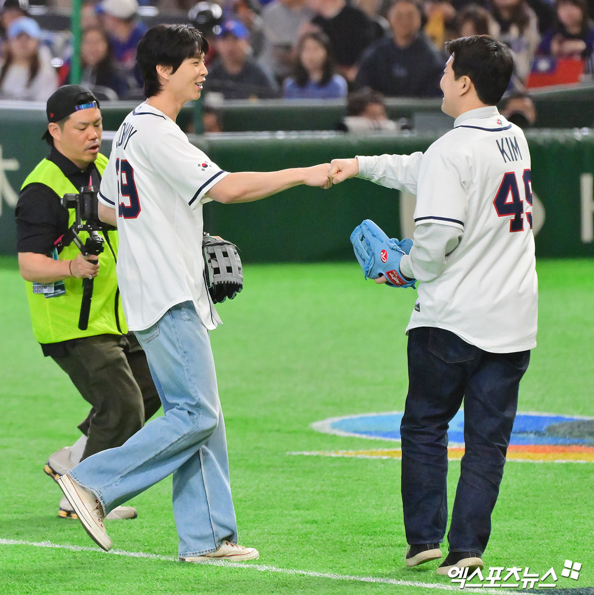 ㅊ(엑스포츠뉴스 도쿄(일본), 김한준 기자) 8일 오후 일본 도쿄돔에서 열린 2026 월드베이스볼클래식(WBC) C조 한국과 대만의 경기, 경기 전 NCT 쟈니가 시구를 마친 후 시포 김병현과 주먹을 맞대고 있다.