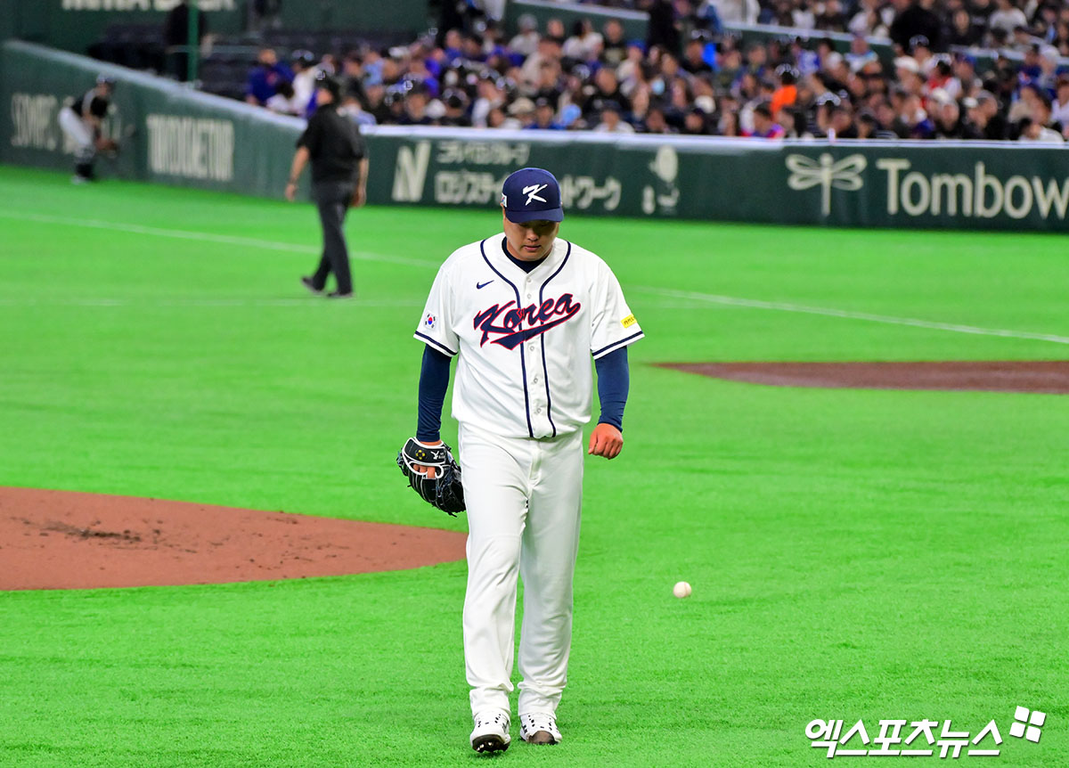 ㅊ(엑스포츠뉴스 도쿄(일본), 김한준 기자) 8일 오후 일본 도쿄돔에서 열린 2026 월드베이스볼클래식(WBC) C조 한국과 대만의 경기, 2회초 수비를 마친 한국 류현진이 더그아웃으로 향하고 있다.