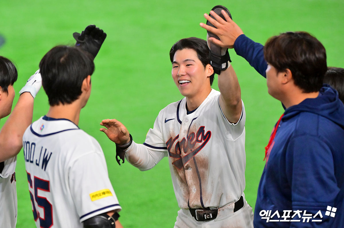 (엑스포츠뉴스 도쿄(일본), 김한준 기자) 8일 오후 일본 도쿄돔에서 열린 2026 월드베이스볼클래식(WBC) C조 한국과 대만의 경기, 8회말 2사 1루 한국 김혜서이 김도영의 1타점 2루타때 득점에 성공한 후 기뻐하고 있다.