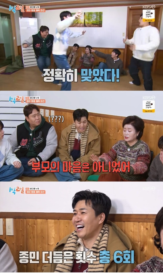 제작진은 멤버들에게 김종민이 딘딘 어머니와 5분 동안 대화를 나누면서 말을 몇 번이나 더듬을지 예측하라고 했다.
