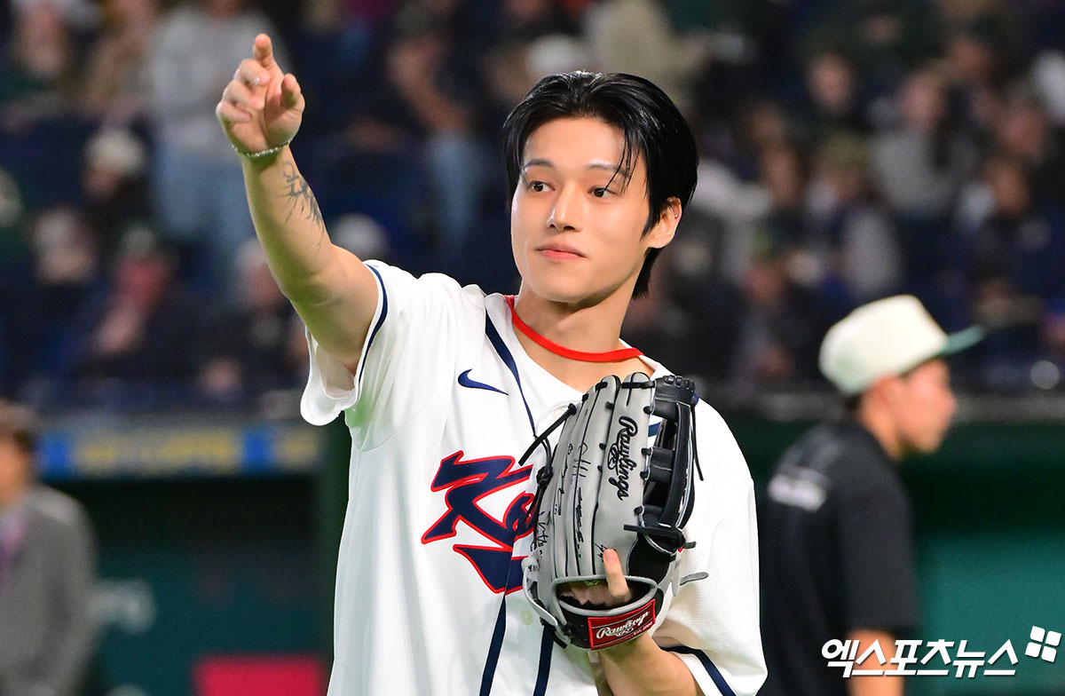(엑스포츠뉴스 도쿄(일본), 김한준 기자) 9일 오후 일본 도쿄돔에서 열린 2026 월드베이스볼클래식(WBC) C조 한국과 호주의 경기, 경기 전 시구자인 에이티즈 우영이 연습을 하고 있다.