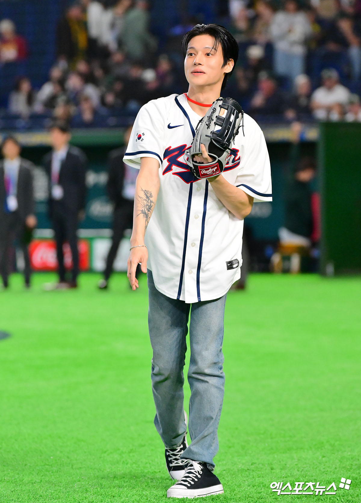 (엑스포츠뉴스 도쿄(일본), 김한준 기자) 9일 오후 일본 도쿄돔에서 열린 2026 월드베이스볼클래식(WBC) C조 한국과 호주의 경기, 에이티즈 우영이 시구 연습을 하고 있다.