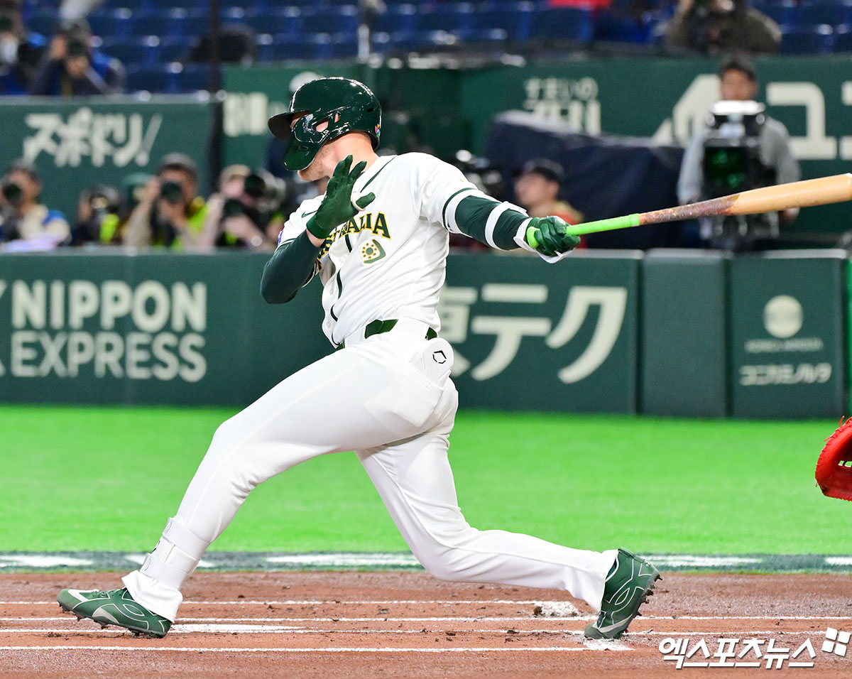 (엑스포츠뉴스 도쿄(일본), 김한준 기자) 9일 오후 일본 도쿄돔에서 열린 2026 월드베이스볼클래식(WBC) C조 한국과 호주의 경기, 1회말 1사 호주 미드가 중전안타를 날리고 있다.