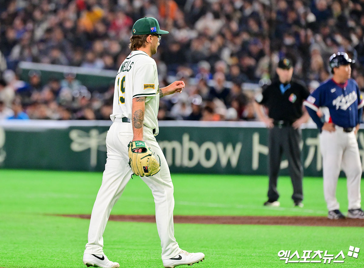 (엑스포츠뉴스 도쿄(일본), 김한준 기자) 9일 오후 일본 도쿄돔에서 열린 2026 월드베이스볼클래식(WBC) C조 한국과 호주의 경기, 2회초 2사 1,2루 호주 라클란 웰스가 강판되고 있다.
